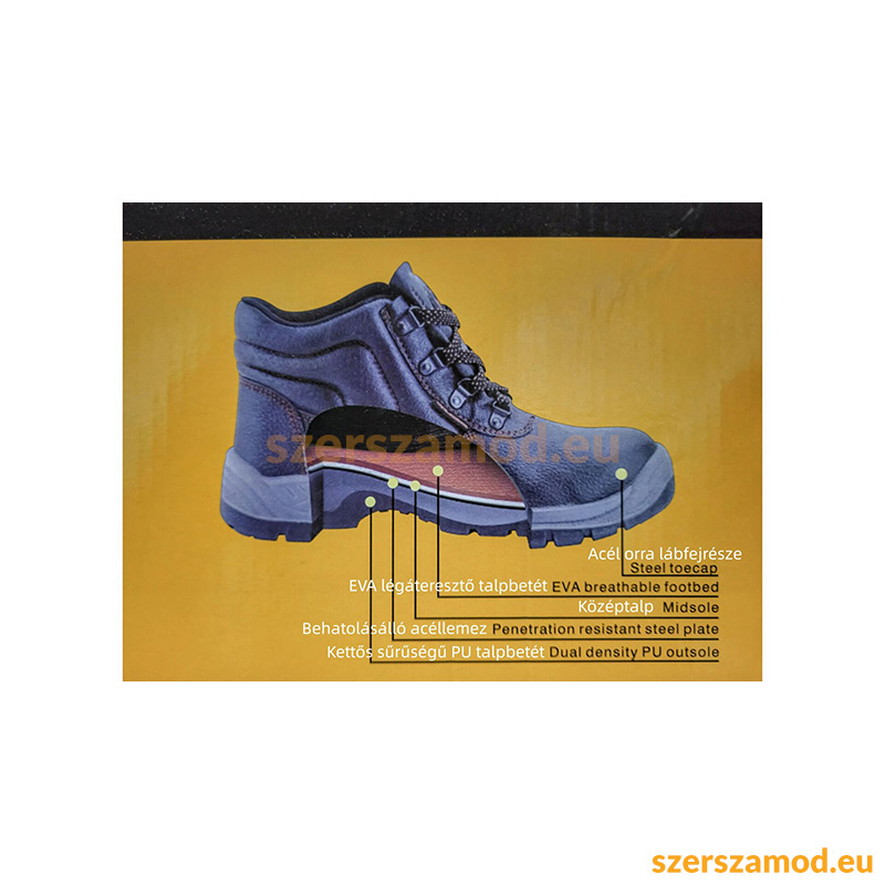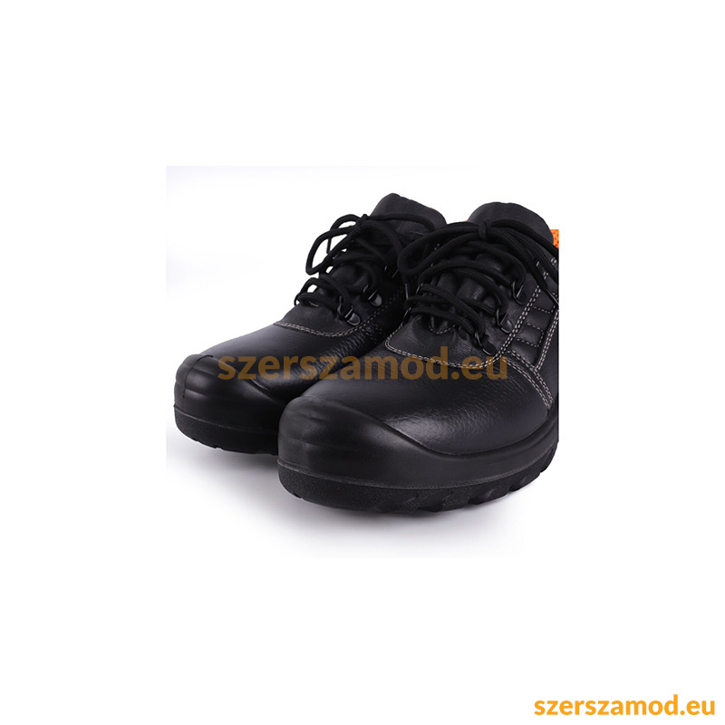 Bőr, fűzős férfi munkavédelmi cipő, orra lábfejrésze és talprésze acélbetétes, talpa jól bordázott.