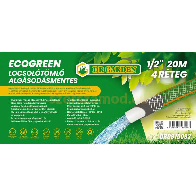 A Garden Deluxe Ecogreen Plus locsolótömlő 1/2 átmérővel és 20 méteres hosszúsággal ideális kisebb és közepes méretű kertek öntözéséhez. A 4 rétegű szerkezet és a textilspirál erősítés stabil működést biztosít. Az algásodásmentes belső réteg segít megelőzni a vízben kialakuló lerakódásokat, így a locsolótömlő hosszabb ideig tiszta marad. A locsolótömlő rugalmas PVC szerkezetének köszönhetően könnyen kezelhető és ellenáll a megtörésnek. A UV-álló külső réteg és a −10°C és +60°C közötti hőmérsékletállóság biztosítja a hosszú élettartamot kültéri használat során.