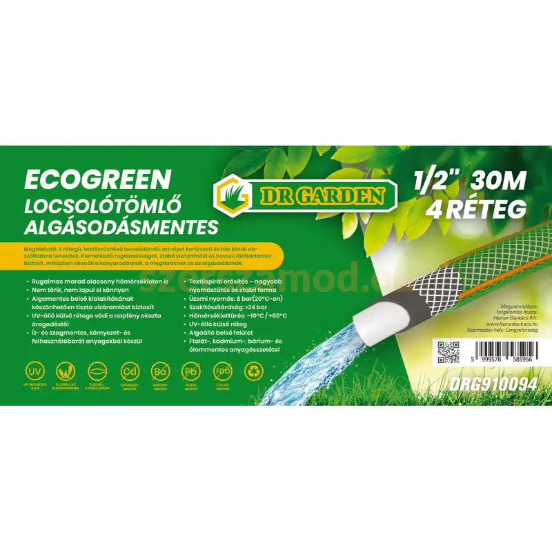 A Garden Deluxe Ecogreen Plus locsolótömlő 30 méteres hosszban ideális kerti öntözési feladatokhoz. A 4 rétegű felépítés és a textilspirál erősítés stabil nyomásállóságot és hosszú élettartamot biztosít. Az algásodásmentes belső réteg megakadályozza a lerakódásokat és segít tisztán tartani a vízáramlást. A locsolótömlő UV-álló külső rétege védi az anyagot a napsugárzástól, miközben a rugalmas PVC szerkezet megakadályozza a megtörést és a lapulást. A locsolótömlő −10°C és +60°C közötti hőmérsékletben is megbízhatóan használható.