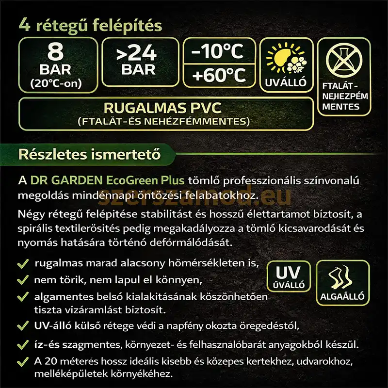 A Garden Deluxe Ecogreen Plus locsolótömlő 50 méteres kivitelben ideális nagyobb kertek öntözésére és hosszabb vízszállítási távolságok esetén. A 4 rétegű szerkezet és a textilspirál erősítés biztosítja a stabil működést és a hosszú élettartamot. Az algásodásmentes belső kialakítás segít megelőzni a vízben kialakuló lerakódásokat, így a locsolótömlő hosszabb ideig tiszta marad. A UV-álló külső réteg védi a tömlőt a napfény okozta károsodástól, miközben a rugalmas PVC szerkezet megakadályozza a megtörést. A locsolótömlő −10°C és +60°C közötti hőmérsékletben is használható.