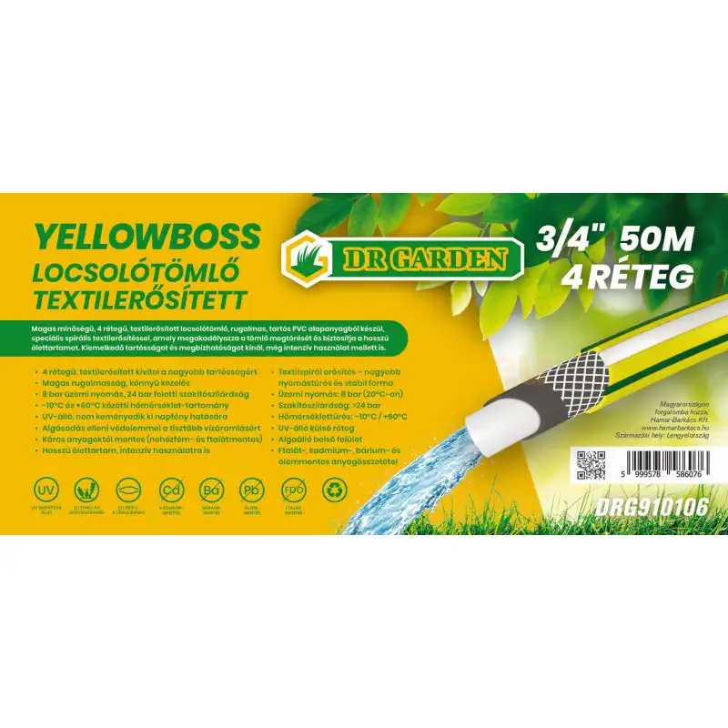 A Garden Deluxe Yellowboss locsolótömlő 50 méteres kivitelben ideális nagyobb kertek és hosszabb öntözési távolságok esetén. A 4 rétegű textilerősített szerkezet és a spirál erősítés biztosítja a stabil működést és a hosszú élettartamot. A locsolótömlő ellenáll a nyomásnak és a mechanikai igénybevételnek, miközben rugalmas marad használat közben. Az algásodás elleni védelem segít tisztán tartani a vízáramlást. A locsolótömlő UV-álló külső rétege védi az anyagot a napsugárzás okozta károsodástól. A −10°C és +60°C közötti hőmérsékletállóság lehetővé teszi a széles körű kültéri használatot.