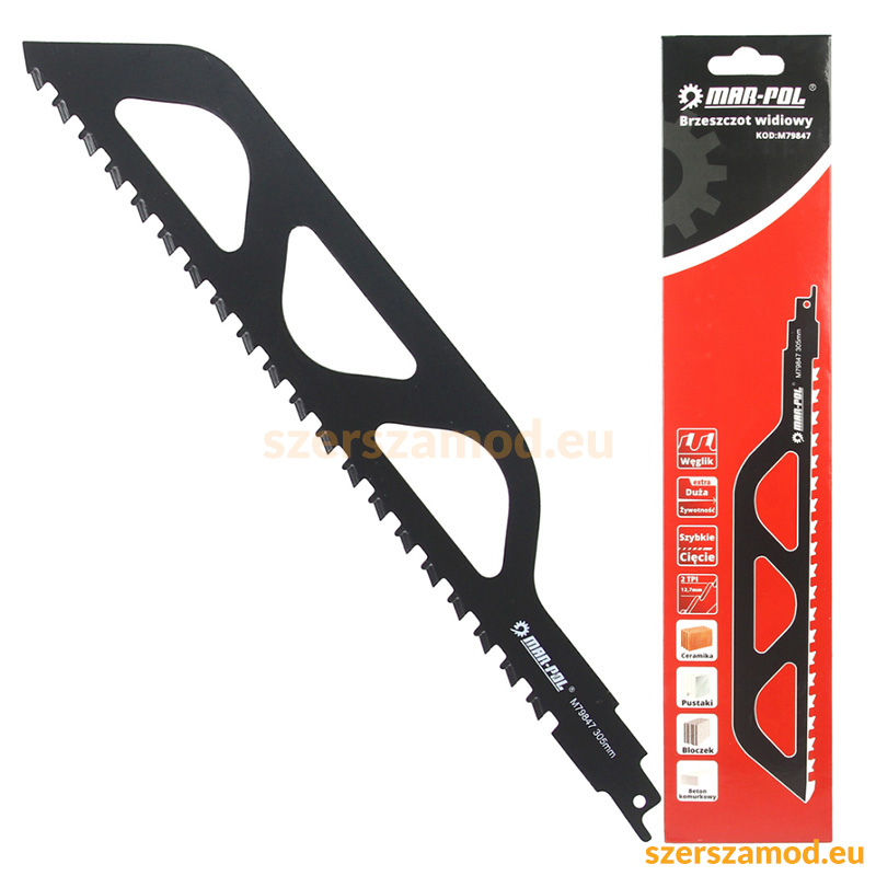 Keményfém hegyű dugattyús fűrészlap. Célbeton, beton, tégla és kerámia blokkok vágására tervezték.